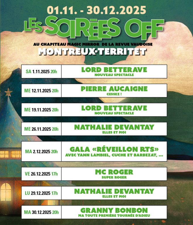 La Revue Vaudoise sera de retour au Port de Territet, à Montreux, dans son désormais traditionnel Magic Mirror, sa scène à 360°, et son espace d’accueil avec bar et restauration ouvert 1h30 avant le début du spectacle, et après.